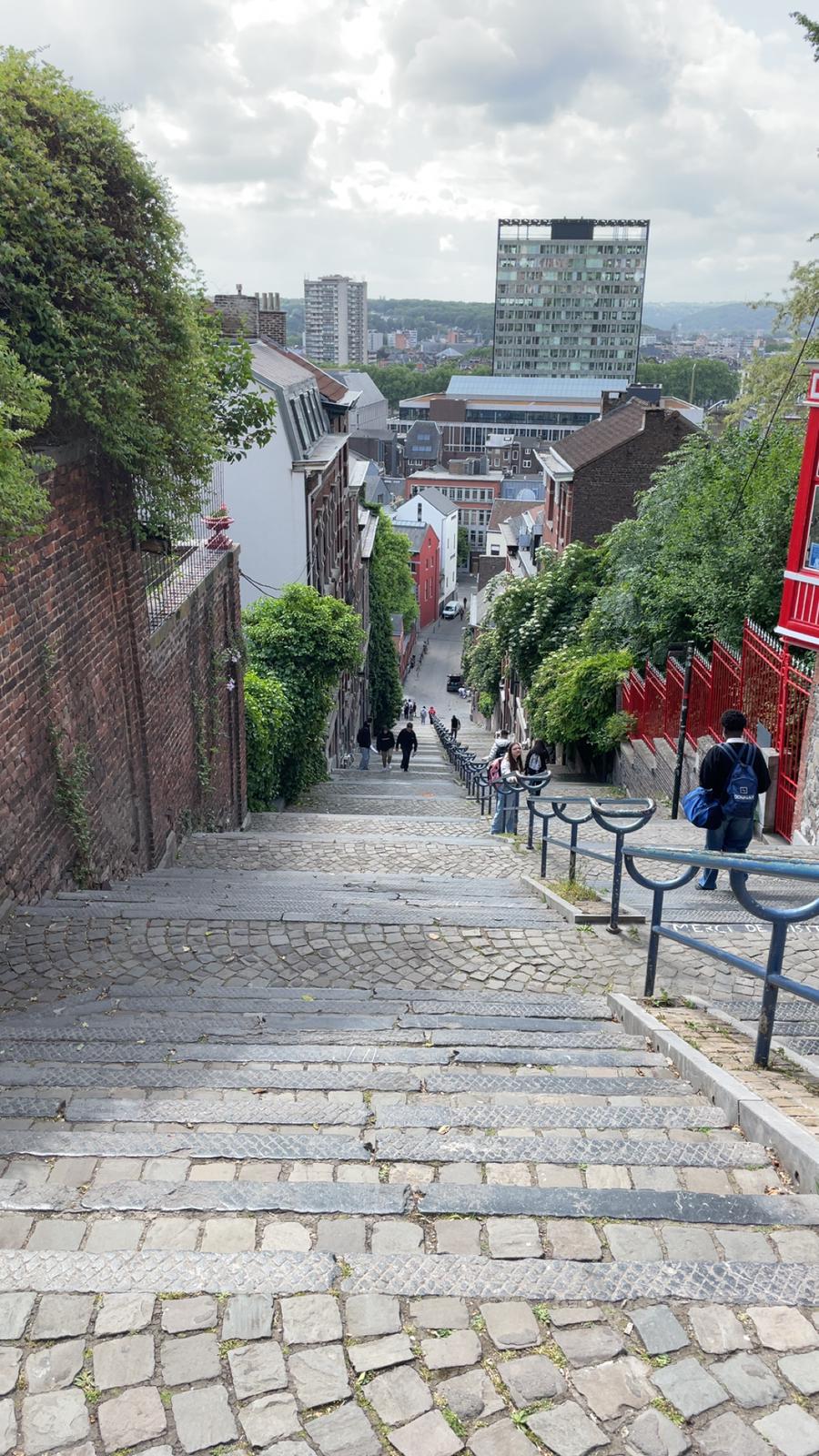 Am Donnerstag, den 22. Mai 2025, machten sich die drei Französischkurse der neunten Klassen an unserem WP-Tag mit dem Bus auf den Weg nach Lüttich in Belgien. Der Ausflug begann sportlich: Gemeinsam wurden die 374 Stufen der Montagne de Bueren nach unten gelaufen – mit tollem Ausblick über die Stadt.
