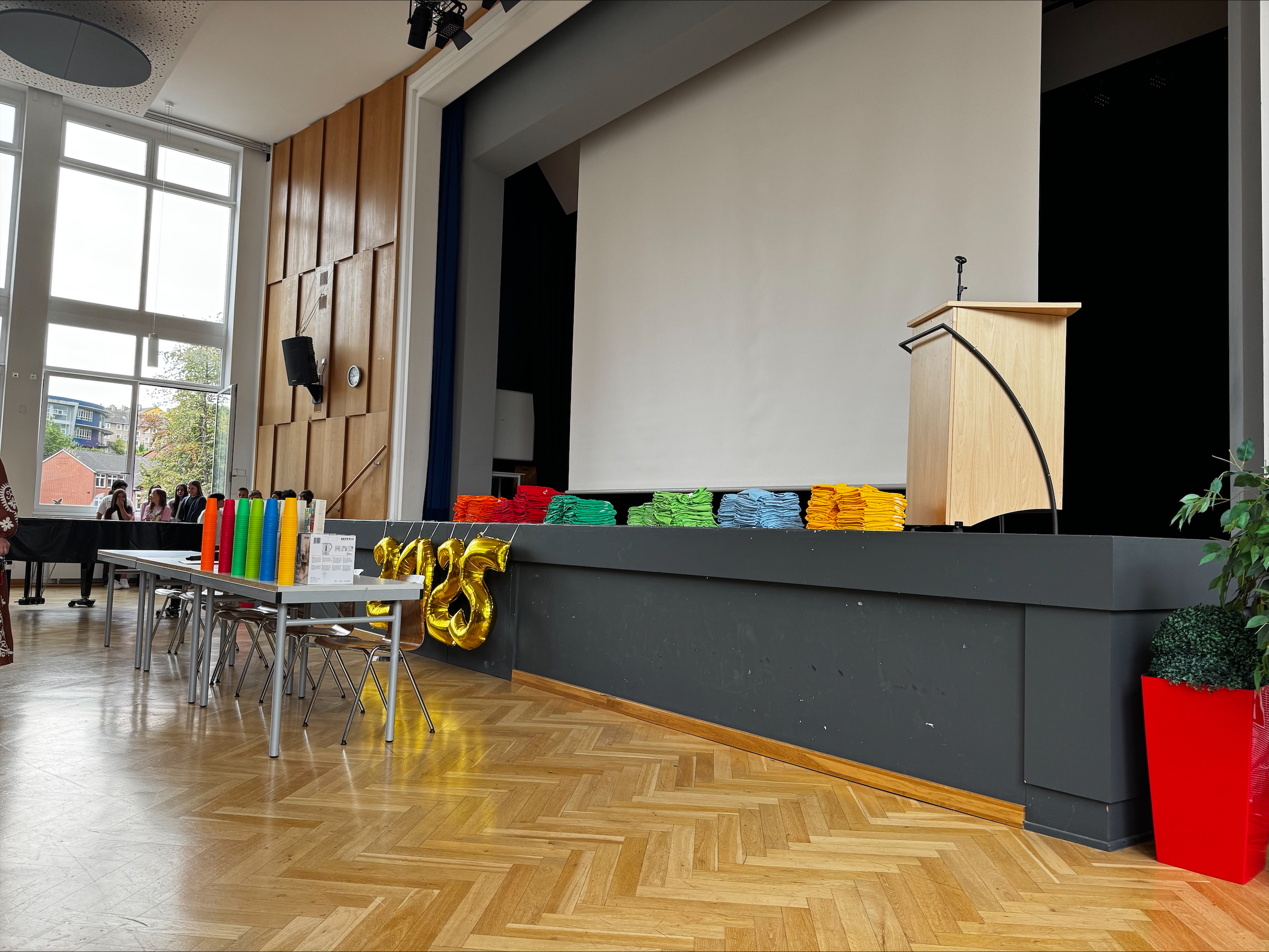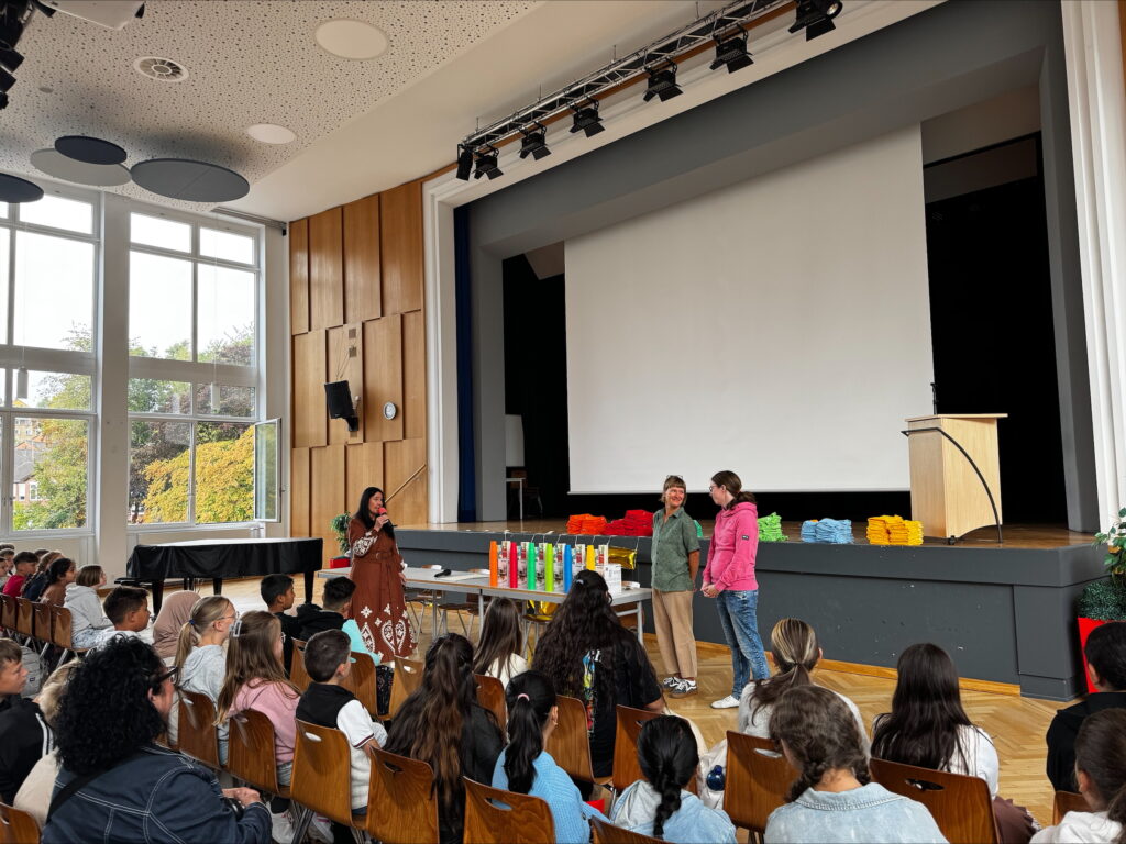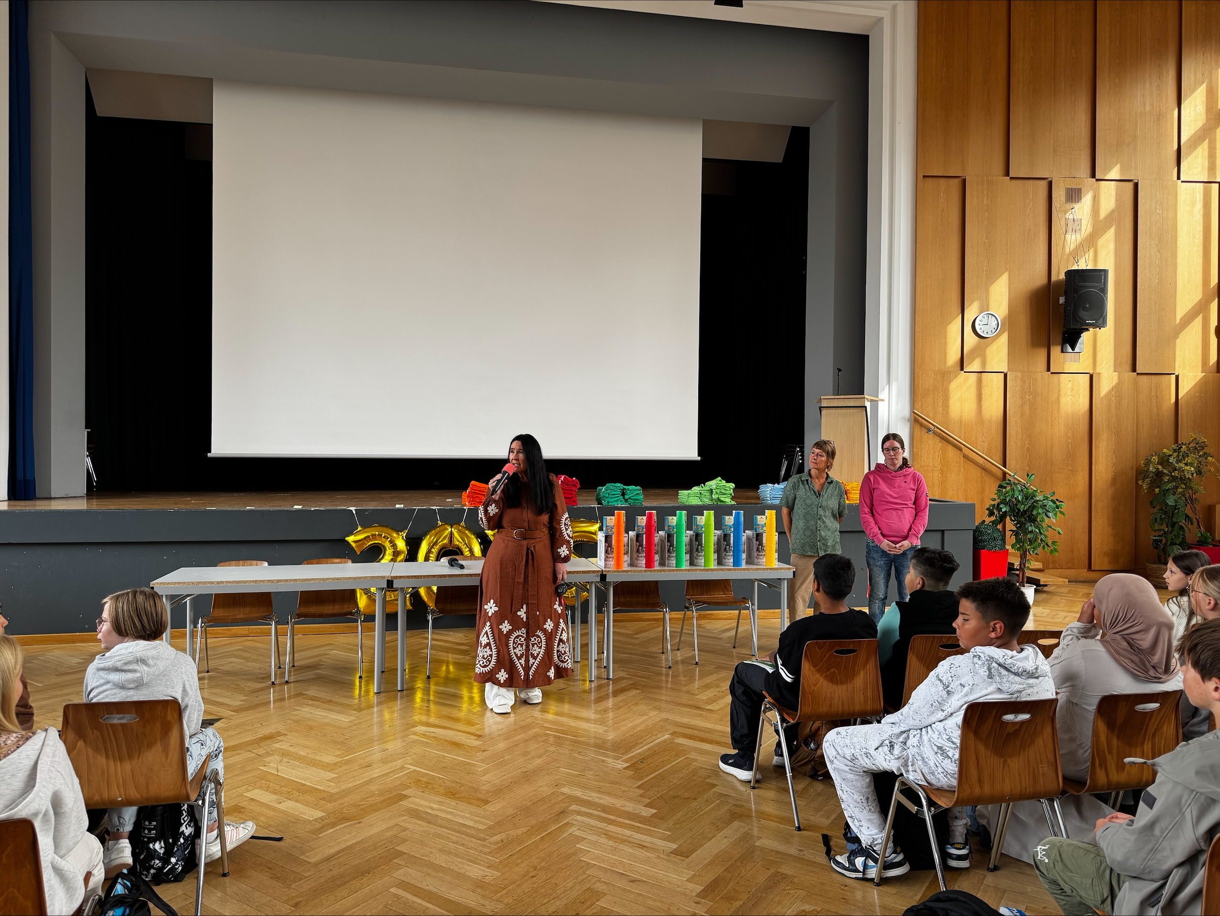 Ebenso waren Frau Sostak vom Mensaverein sowie Frau Heitlindemann von unserem Förderverein anwesend, um die tollen Geschenke an alle Klassen zu überreichen: Alle Klassen erhielten sowohl Trinkbecher, Teekocher und die neuen Schulshirts in ihrer Klassenfarbe.