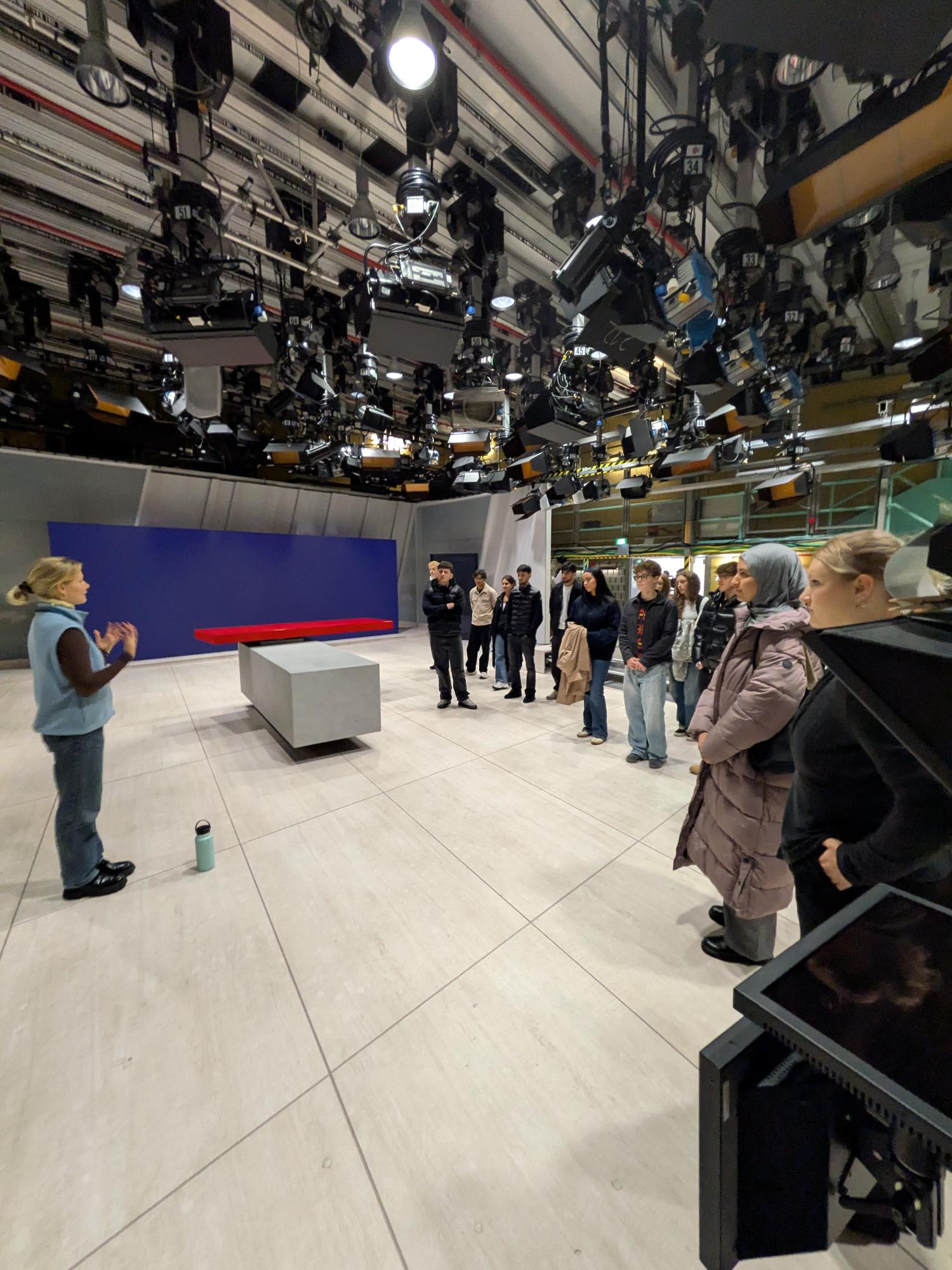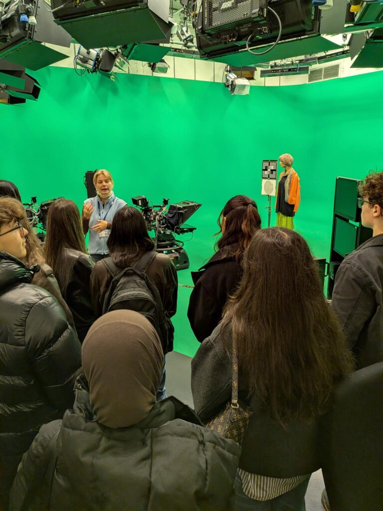 Im Rahmen des heutigen ARD Jugendmedientages besuchte der Q1 Projektkurs Journalismus mit Frau Schmidt die Fernsehstudios des WDR in Köln. Interessiert ließen sich die SchülerInnen erklären, wie der „Green Screen“ in der Fernsehproduktion zum Beispiel für Nachrichtenformate verwendet wird, um unterschiedliche Hintergründe produzieren zu können.
