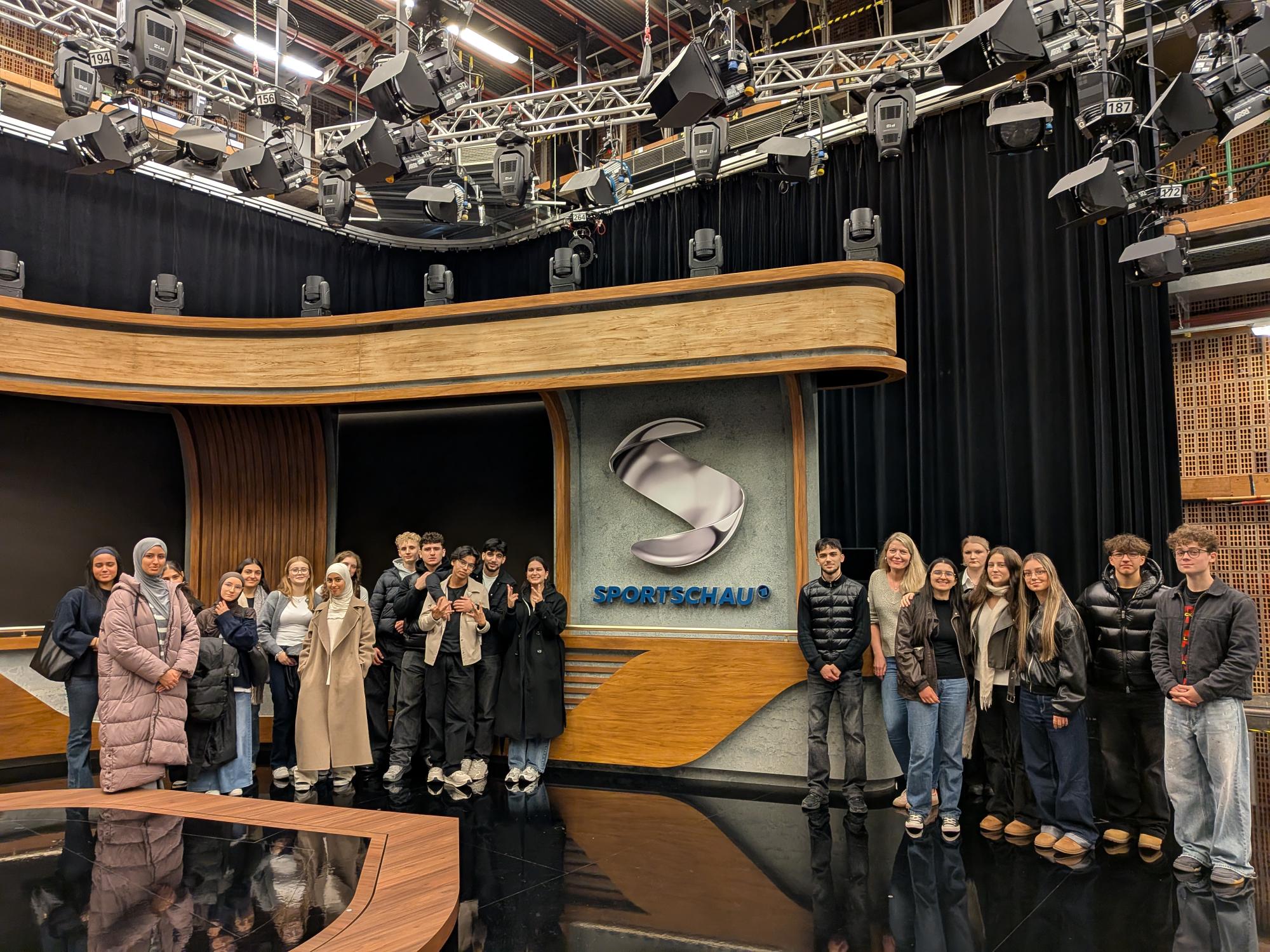 Wie unspektakulär ein Fernsehstudio eigentlich ohne die Technik und die Moderatoren aussieht, konnten die SchülerInnen im Studio der WDR Lokalzeit erfahren. Im Tonstudio lernten die Gäste, wie für eine Hörspielproduktion Geräusche und Töne mittels einfacher Gegenstände kreiert werden. Natürlich durften die Lernenden dann auch selbst ausprobieren, wie es sich anhört, wenn man in einem extra schallreduzierten Tonstudio gegen die gedämmte Wand spricht oder wahlweise schreit. Das Highlight war der Besuch des Fernsehstudios der „Sportschau“ und die damit verbundene Vorstellung, dass schon große Sportler, wie z.B. Bastian Schweinsteiger, auf der Bühne standen. Verwunderlich ist es zudem, dass es für die Prominenten keinen speziellen Weg ins Studio gibt, sie stattdessen ebenfalls die vielen Treppenstufen in den Keller des WDR Gebäudes hinuntergehen müssen wie die Q1 Schülerinnen.