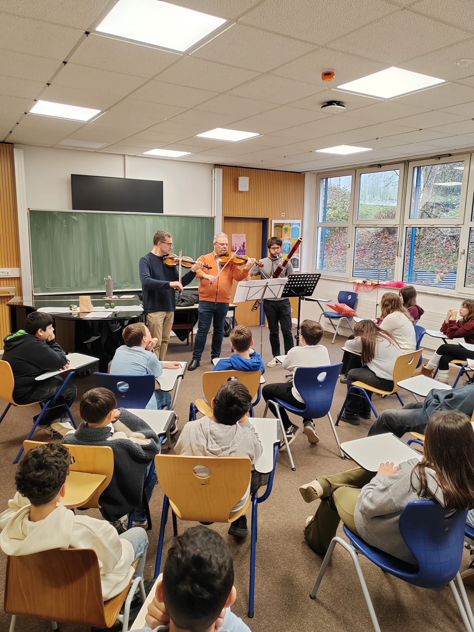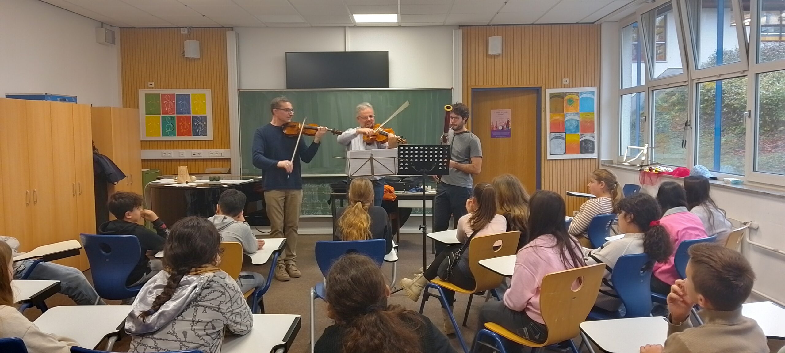 Wir hörten zunächst Auszüge aus Beethovens 5. Symphonie, gespielt auf Violine, Bratsche und Fagott.