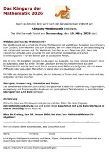 wie in jedem Jahr nimmt unsere Schule wieder am Känguruwettbewerb teil. Dazu müssten sich bitte alle Interessierten bis spätestens 30.01.26 bei Frau Gassa, Frau Schulz oder ihrer Mathematiklehrkraft anmelden.