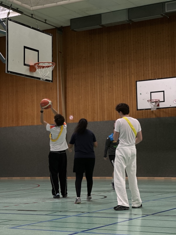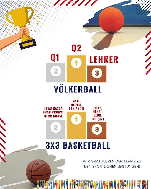 Anschließend folgte das 3×3 Basketballturnier. Acht Mannschaften traten in zwei Gruppen gegeneinander an und kämpften um den Turniersieg. Nach einer kurzen und intensiven Gruppenphase wurden die Plätze acht bis fünf ausgespielt. Danach folgten die Spiele um die Podestplätze. In hart erkämpften Begegnungen behauptete sich schließlich das Team der Q1 (Mali, Kerem und Deniz) vor dem Lehrer*innenteam (Frau Gassa, Frau Probst und Herr Kruse). Platz drei ging an das Team der Q2 (Jelle, Henri, Lio und Leon).