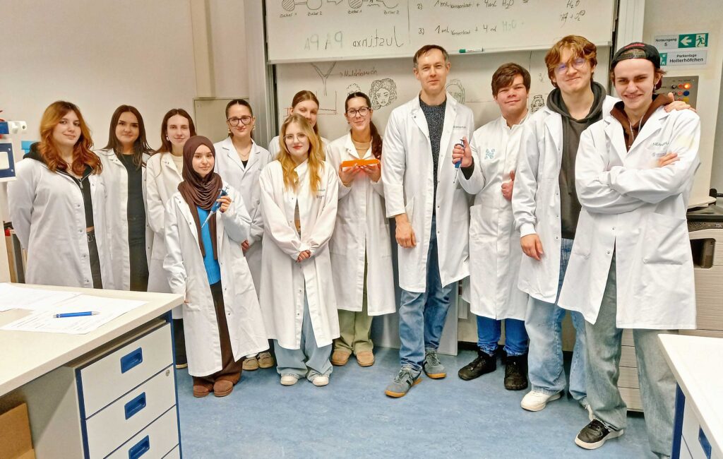 Am 13.02.2026 besuchte der Q2-Biologie-Leistungskurs von Herrn Kandula das Neanderlab in Hilden, mit dem unsere Schule bereits eine langjährige Kooperation pflegt. Die Schüler*innen erarbeiteten eine Antwort auf die Forschungsfrage „Wie viel Neandertaler-DNA steckt in uns?“, indem sie die molekulargenetischen Methoden PCR (Polymerasekettenreaktion) und Gelelektrophorese sowie den Umgang mit Mikropipetten erlernten und anwendeten. Das praktische Arbeiten im Labor machte allen viel Freude und diente gleichzeitig der Vorbereitung auf die bevorstehenden Abiturprüfungen.