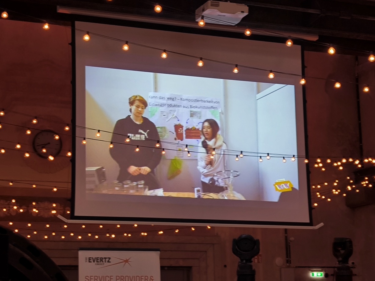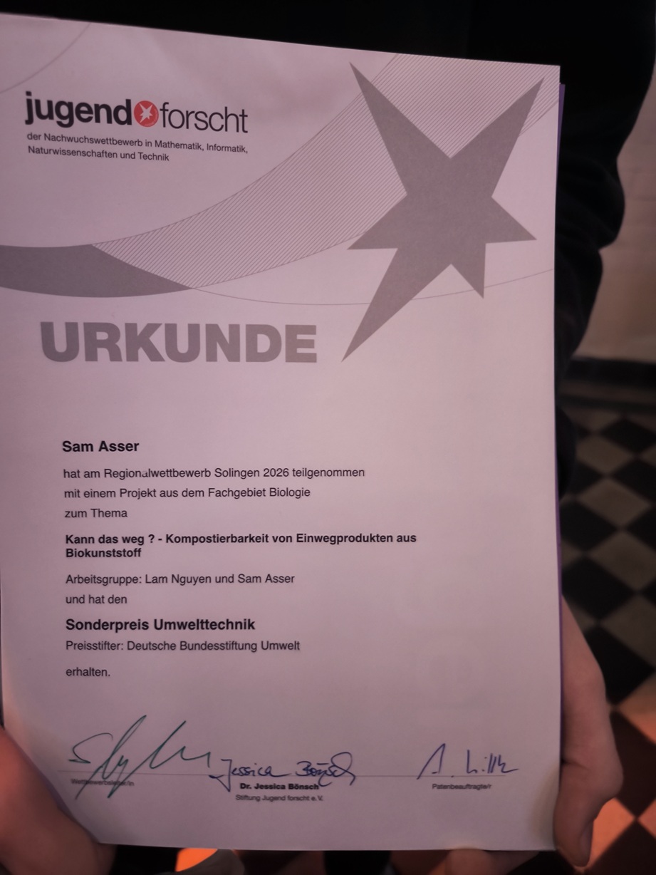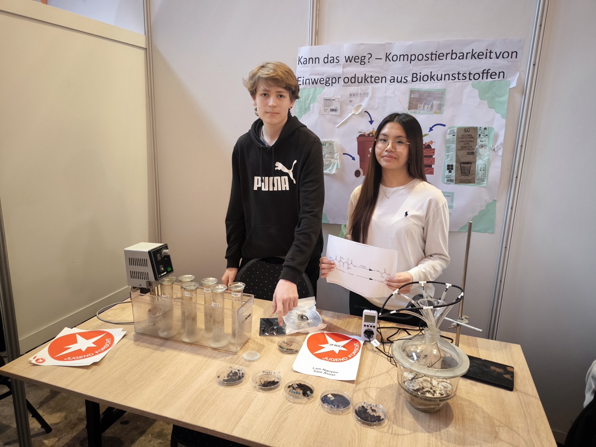 Unsere jungen Forscher traten mit Ihrer Arbeit zum Thema „Kann das weg? – Kompostierbarkeit von Einwegprodukten aus Biokunststoffen“ an.