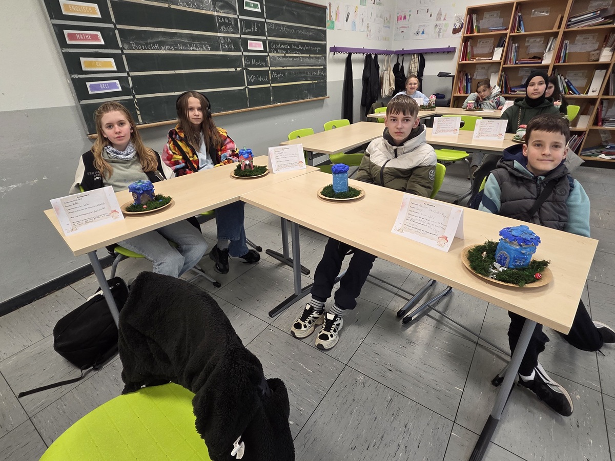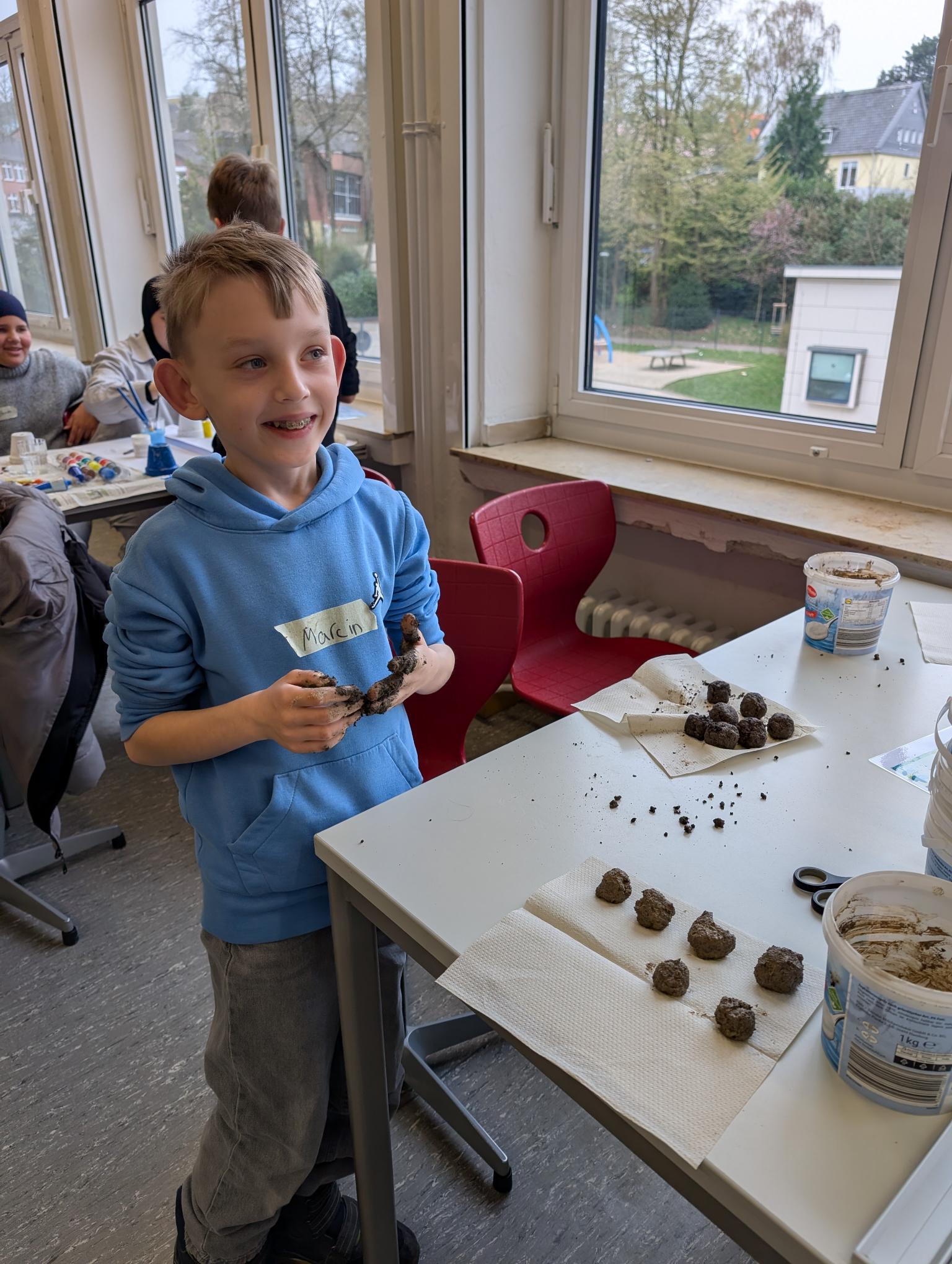 Nachhaltigkeitswerkstatt von Frau Tilli und Frau Zysk: Unsere fleißigen Bienchen bemalen Blumentöpfe, die morgen mit insektenfreundlichen Blumen bepflanzt werden, basteln Samenkugeln und bereiten die Plakate für den Präsentationstag vor.