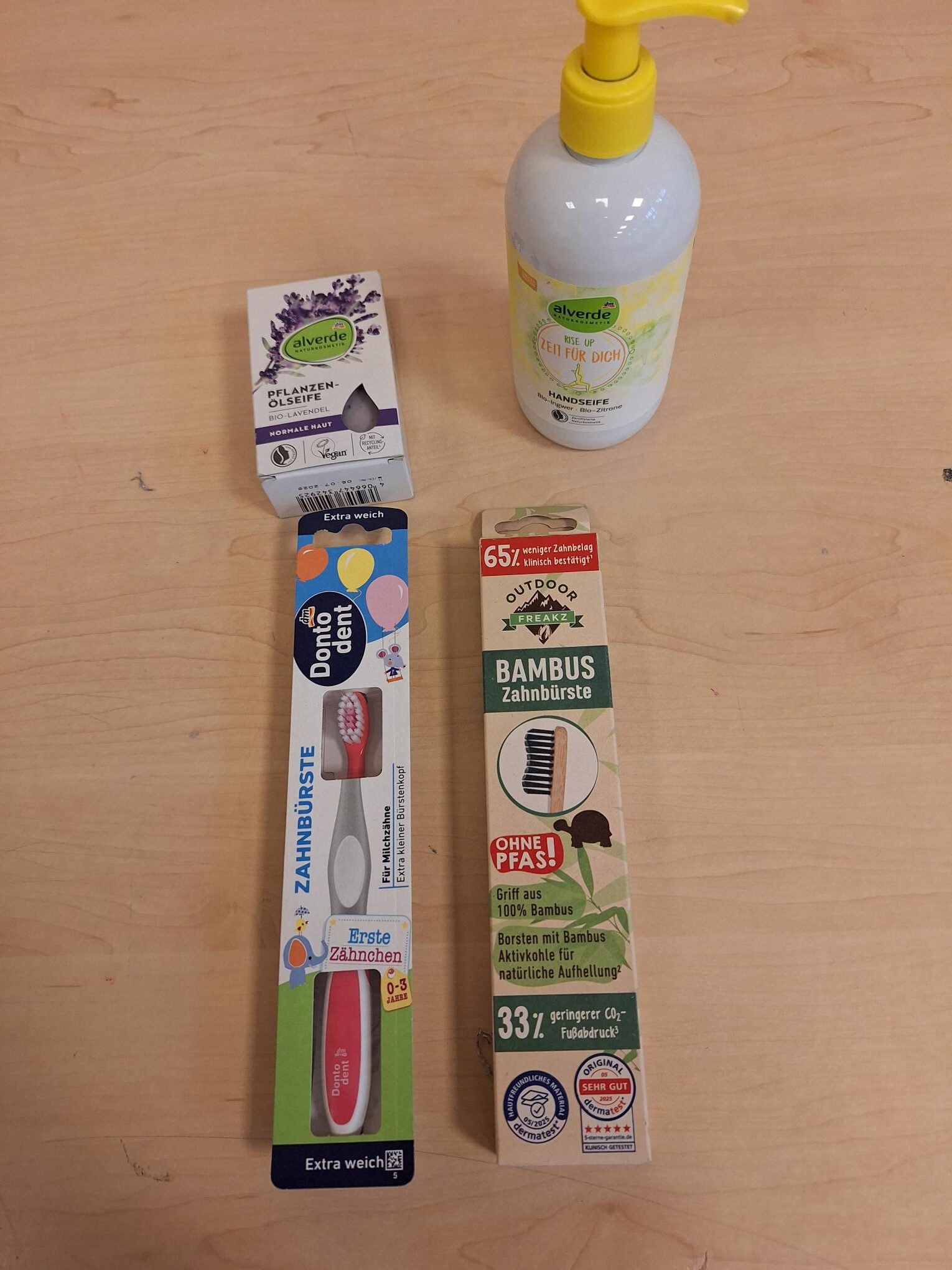 Um das Thema nicht nur theoretisch zu behandeln, unternahmen wir eine Exkursion in verschiedene Supermärkte wie Aldi und Lidl. Dort untersuchten die Schülerinnen und Schüler ausgewählte Produkte genauer und führten Vergleichskäufe durch. Ziel war es herauszufinden, ob es nachhaltigere Alternativen gibt – zum Beispiel der Vergleich zwischen herkömmlichen Plastikzahnbürsten und umweltfreundlicheren Bambuszahnbürsten.