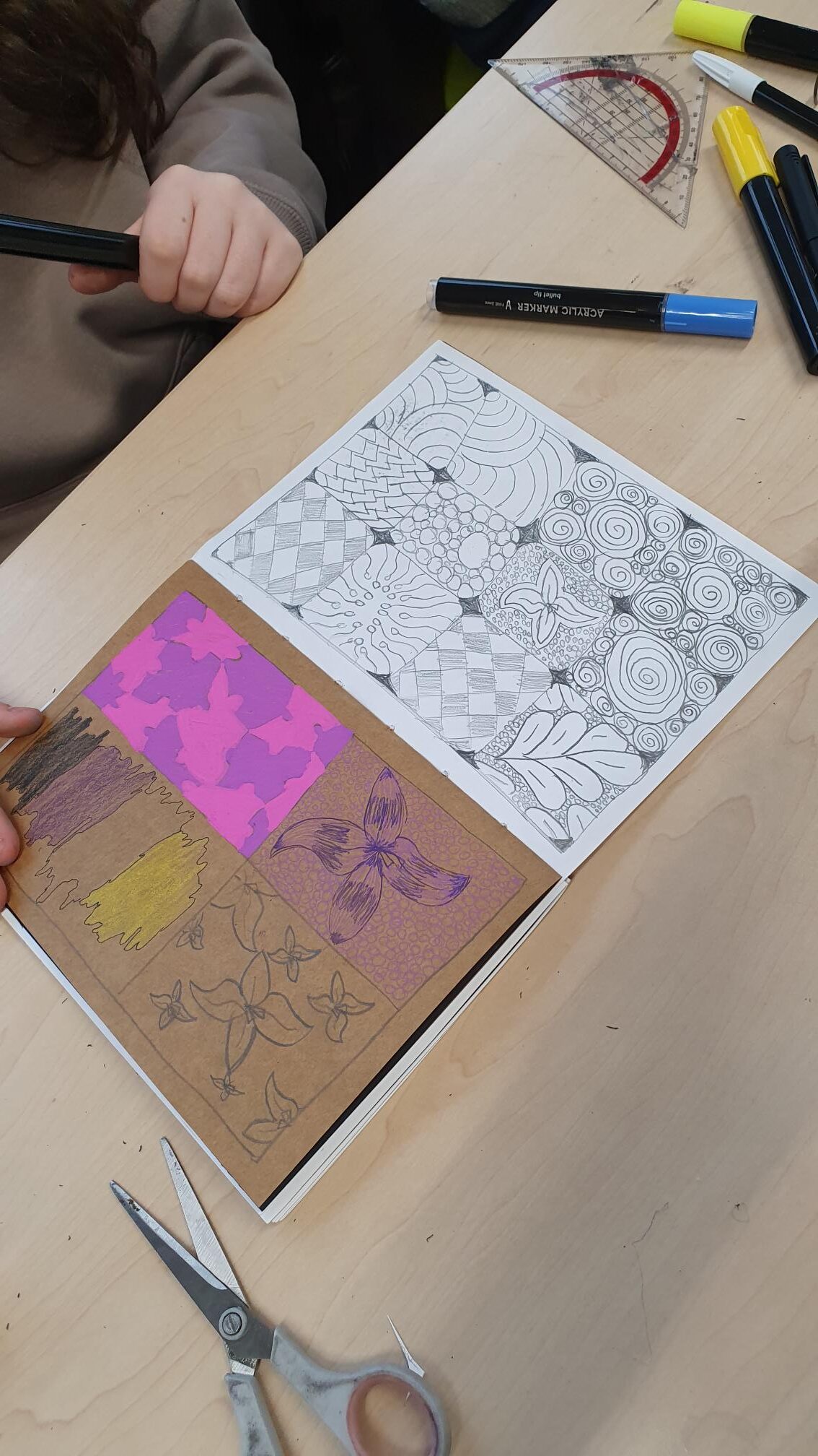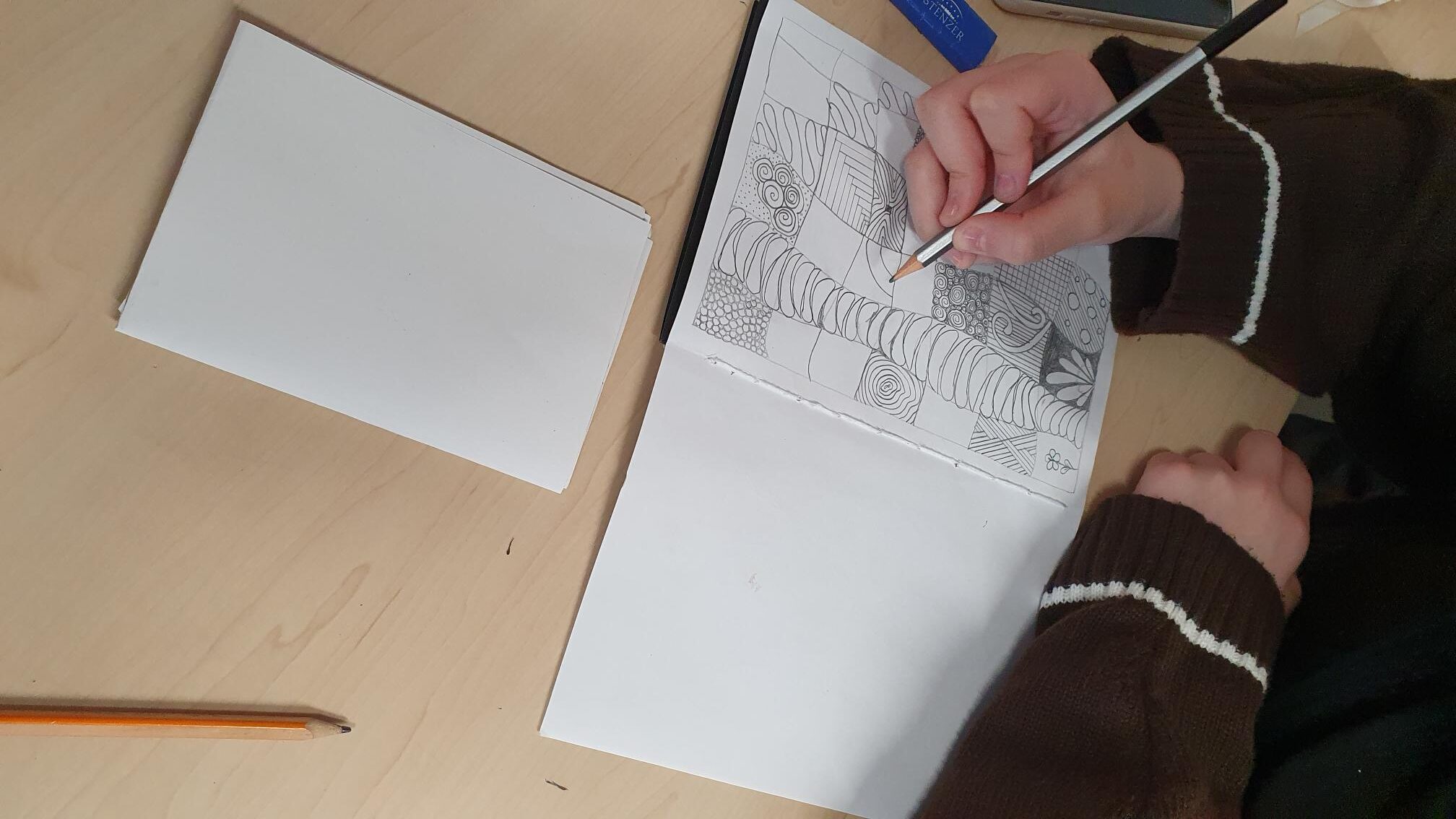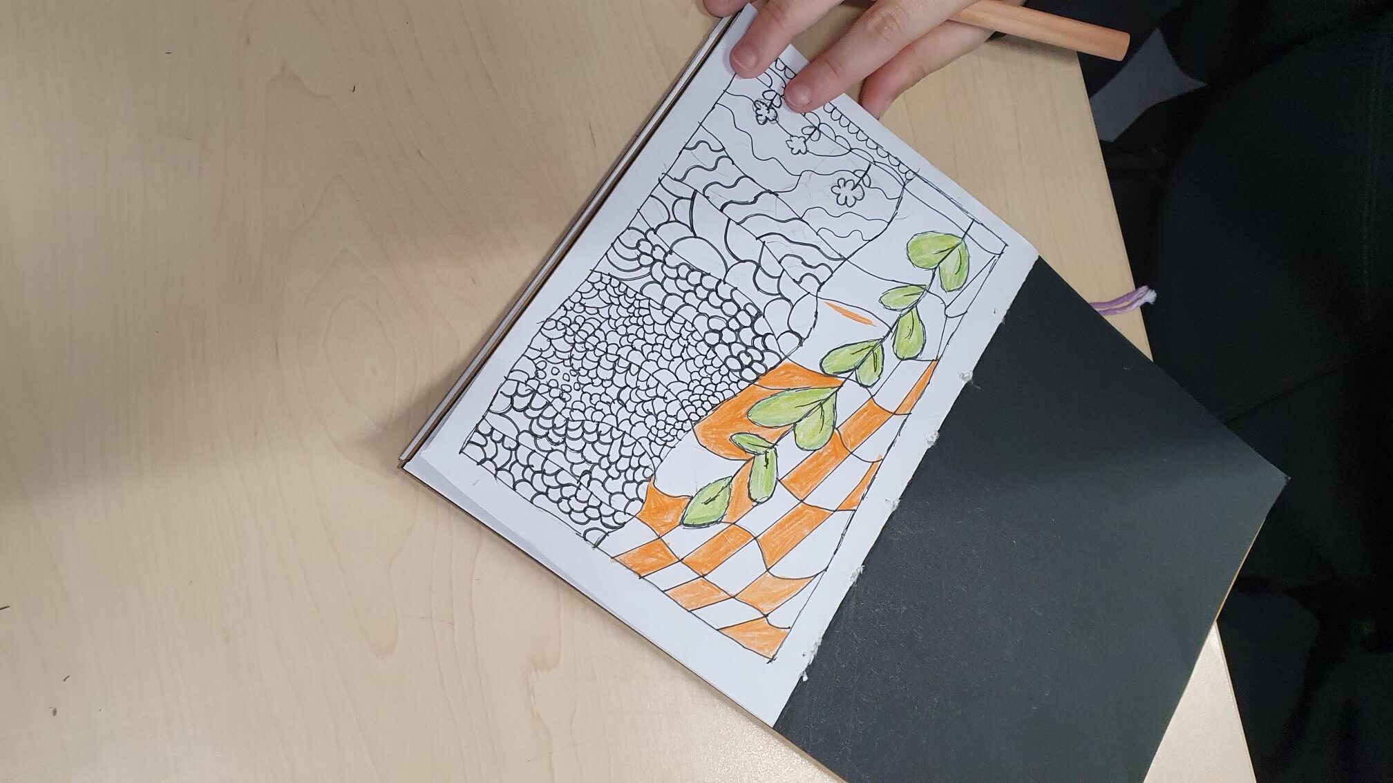 Sketchbooking von Frau Echterhoff: Wir haben mit der offenen Ketten-/Fadenbindung verschiedene Papiere in ein persönliches Sketchbook gebunden – sehr herausfordernd, aber letztlich hielt jede Teilnehmer:in ihr eigenes Büchlein in der Hand, das mit verschiedenen Zentangle – Mustern gestaltet werden konnte. Auch verschiedene Zufallstechniken mit Wasserfarben haben ihren Weg in die Sketchbücher gefunden und sind zum Teil im Stil von Zentangle weitergeführt worden. Immer wieder waren die Teilnehmer:in ganz „im flow“ und habe die entspannende Wirkung dieser kreativen Arbeitsweisen erlebt.