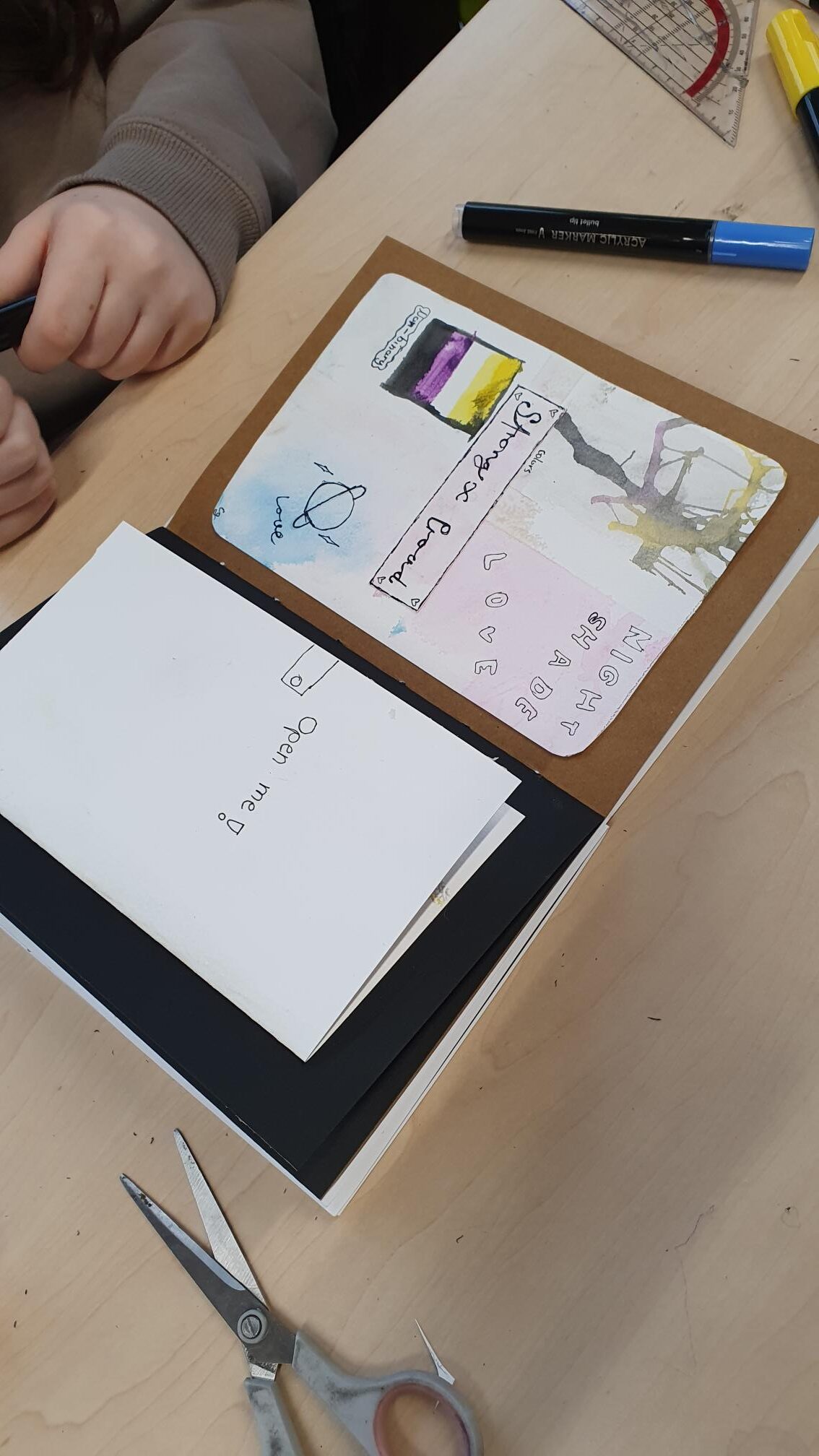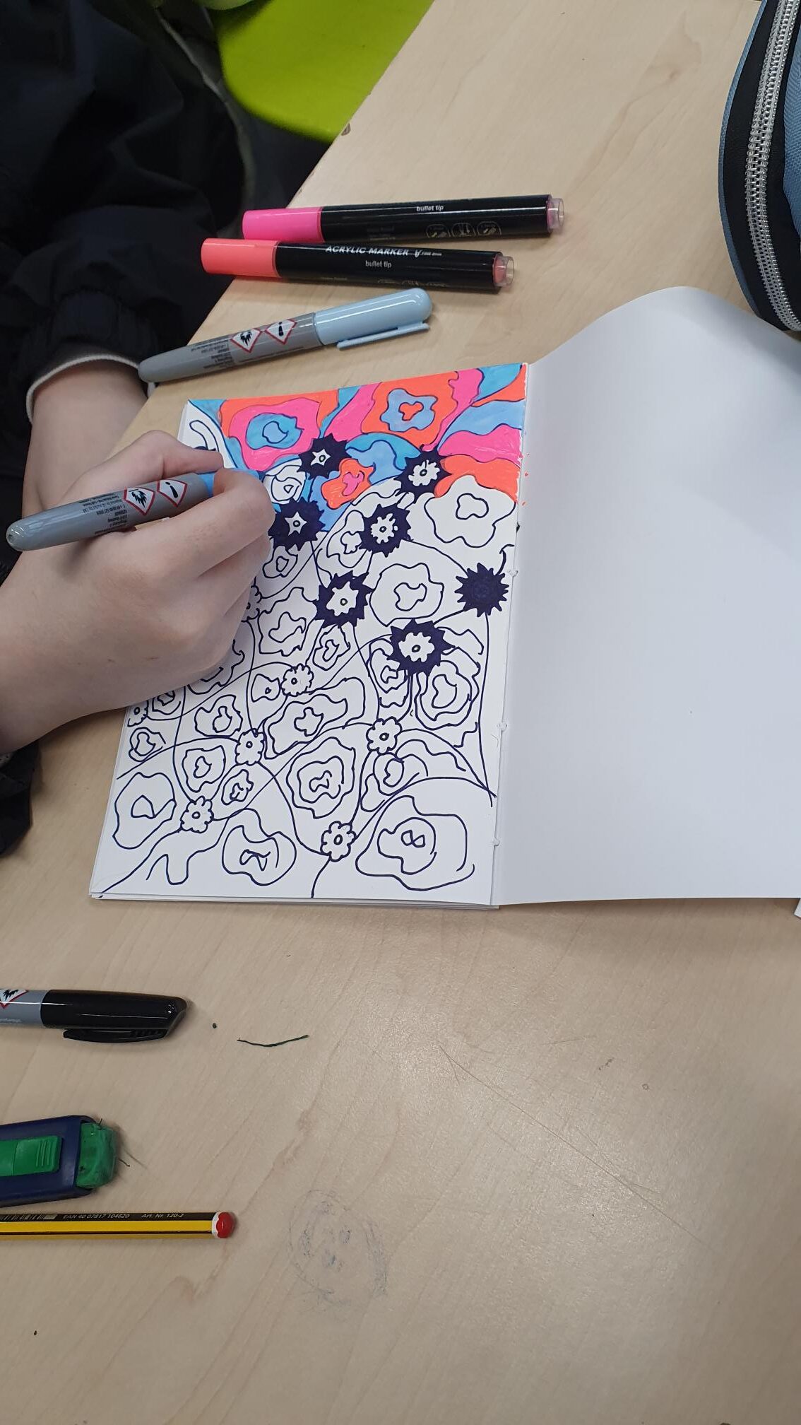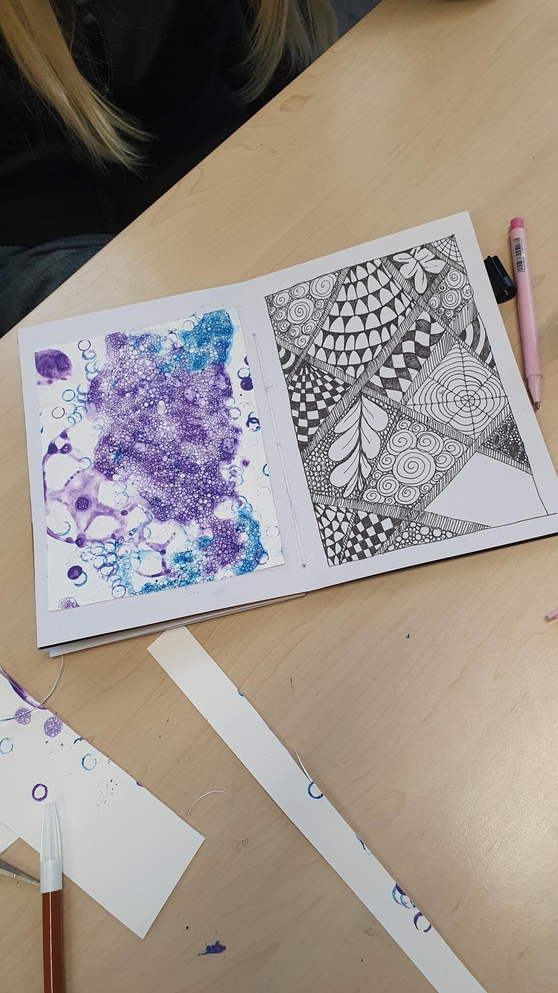 Sketchbooking von Frau Echterhoff: Wir haben mit der offenen Ketten-/Fadenbindung verschiedene Papiere in ein persönliches Sketchbook gebunden – sehr herausfordernd, aber letztlich hielt jede Teilnehmer:in ihr eigenes Büchlein in der Hand, das mit verschiedenen Zentangle – Mustern gestaltet werden konnte. Auch verschiedene Zufallstechniken mit Wasserfarben haben ihren Weg in die Sketchbücher gefunden und sind zum Teil im Stil von Zentangle weitergeführt worden. Immer wieder waren die Teilnehmer:in ganz „im flow“ und habe die entspannende Wirkung dieser kreativen Arbeitsweisen erlebt.