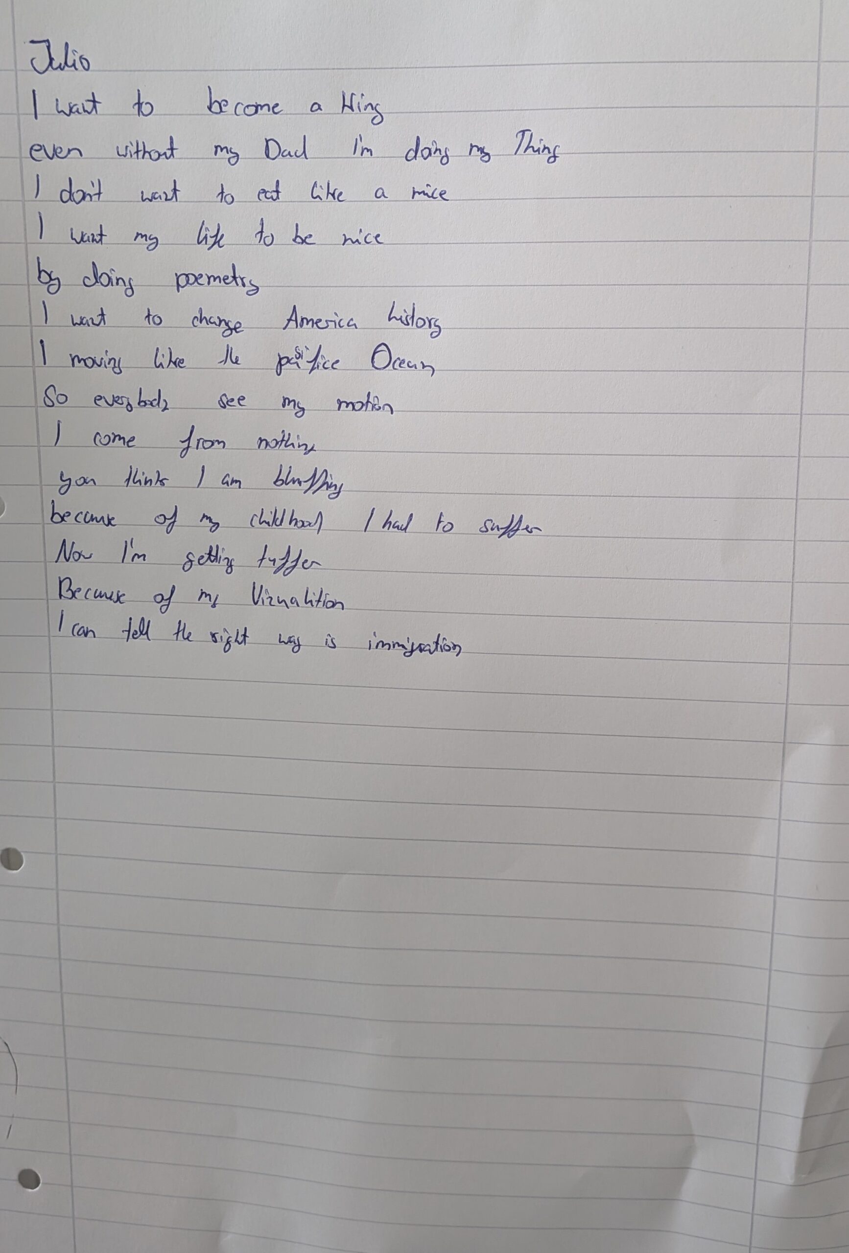 Im EF‑Englischkurs von Frau van Bel beschäftigten sich die Schüler*innen mit dem übergeordneten Reihenthema Global Challenges und setzten sich dabei besonders mit Themen wie Immigration und Climate Change auseinander. Zum Abschluss der Reihe verfassten sie eigene kreative Produkte und konnten zwischen zwei Formaten wählen: einem Gedicht oder einem Tagebucheintrag, welchen sie aus der Perspektive eines Immigranten in den USA schrieben.