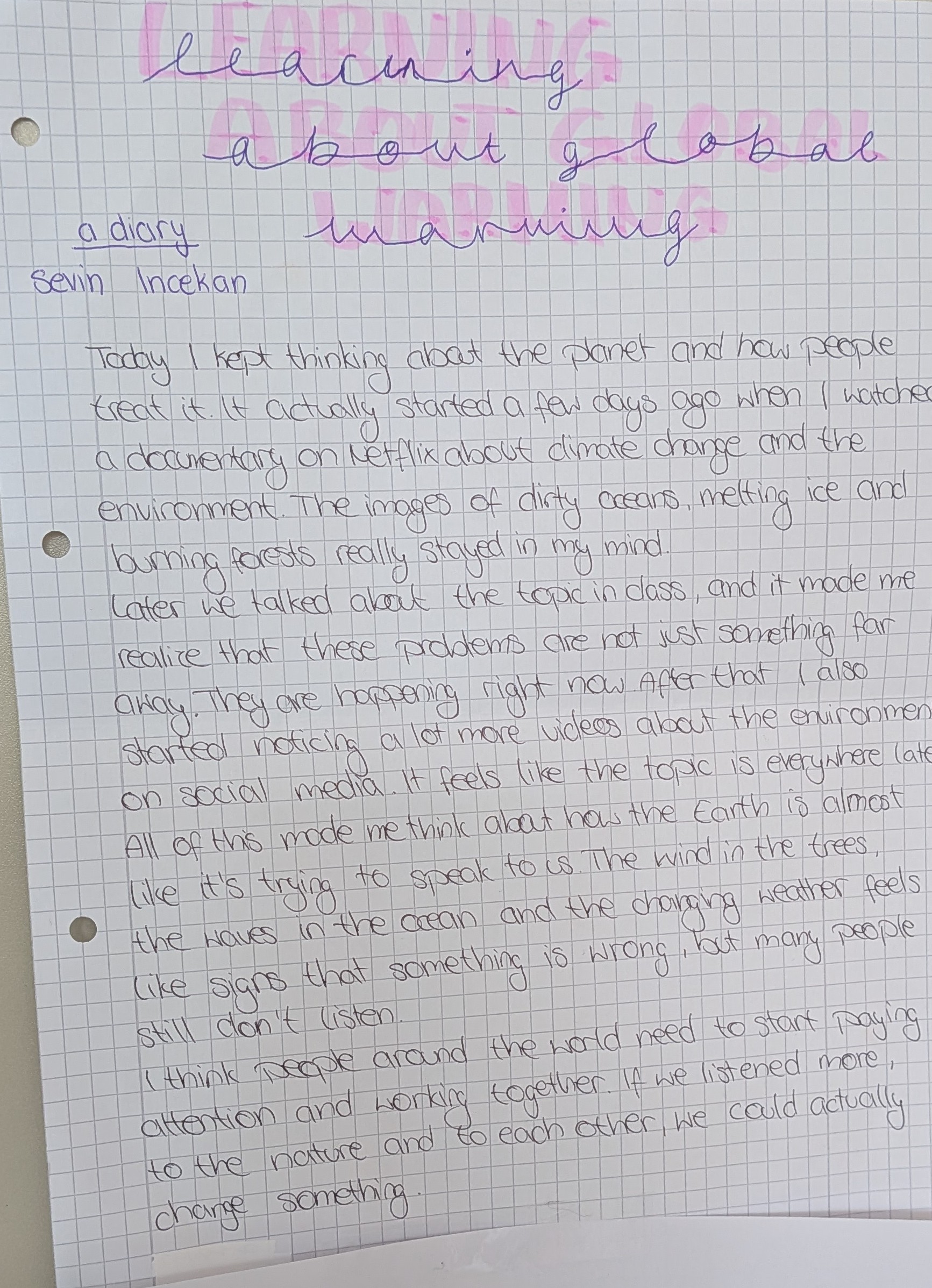Die Schüler*innen haben mit großem Engagement gearbeitet und ihrer Kreativität freien Lauf gelassen. Entstanden sind beeindruckende Texte, in denen sie Empathie und Perspektivwechsel geübt haben – Fähigkeiten, die für das Verständnis globaler Herausforderungen von zentraler Bedeutung und Voraussetzung für eine verantwortungsvolle Beteiligung in der globalen Gesellschaft sind.