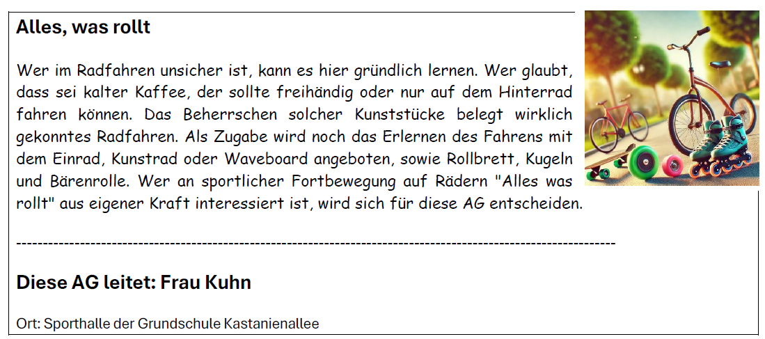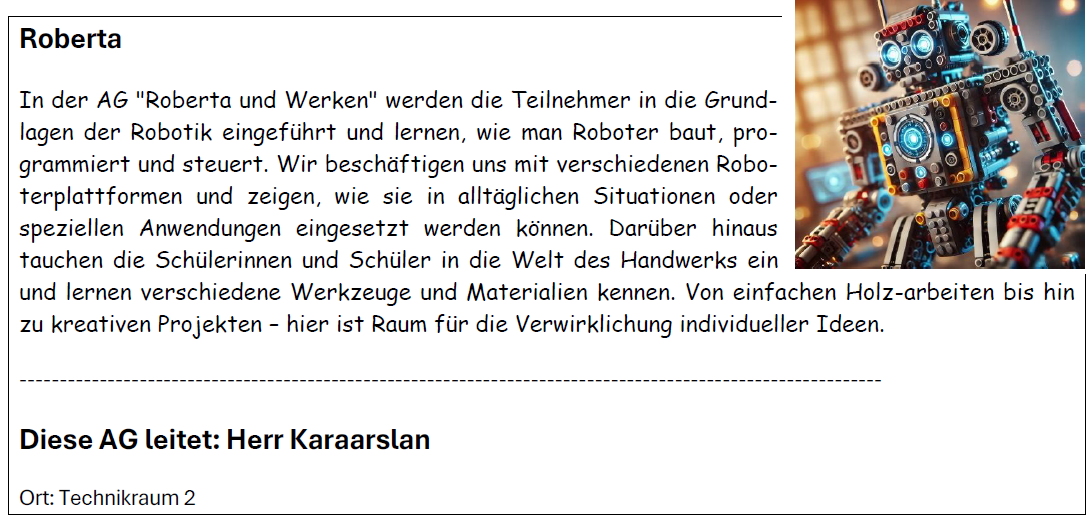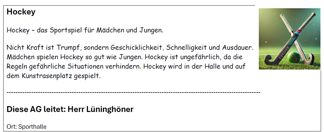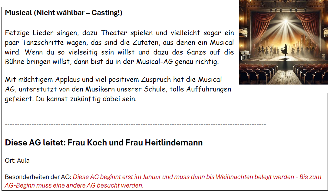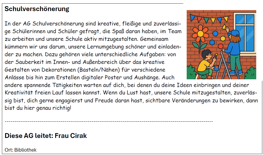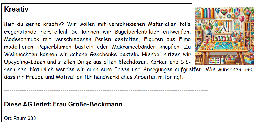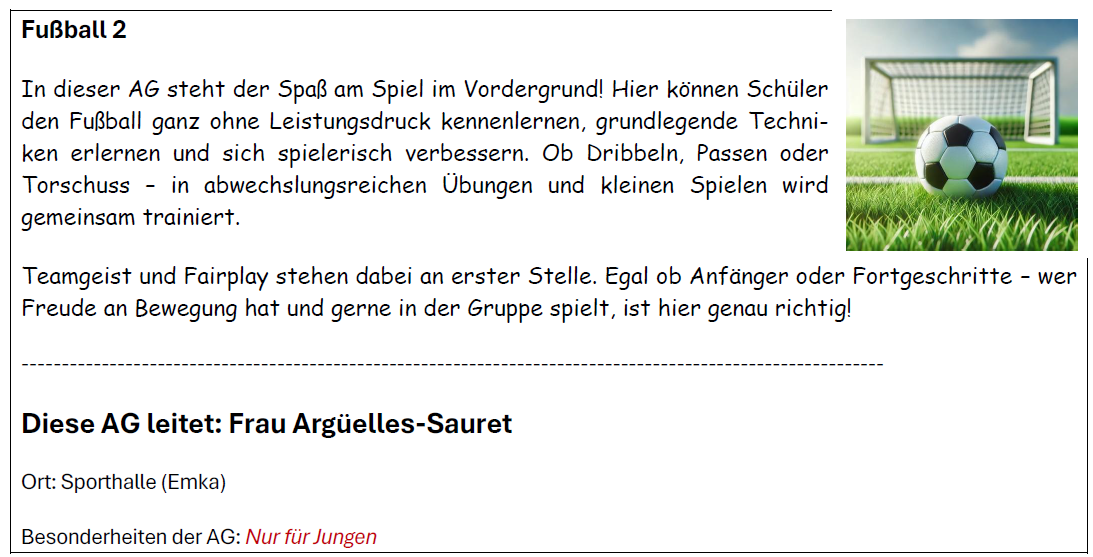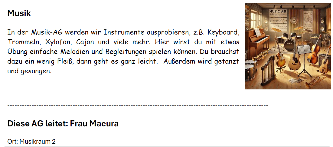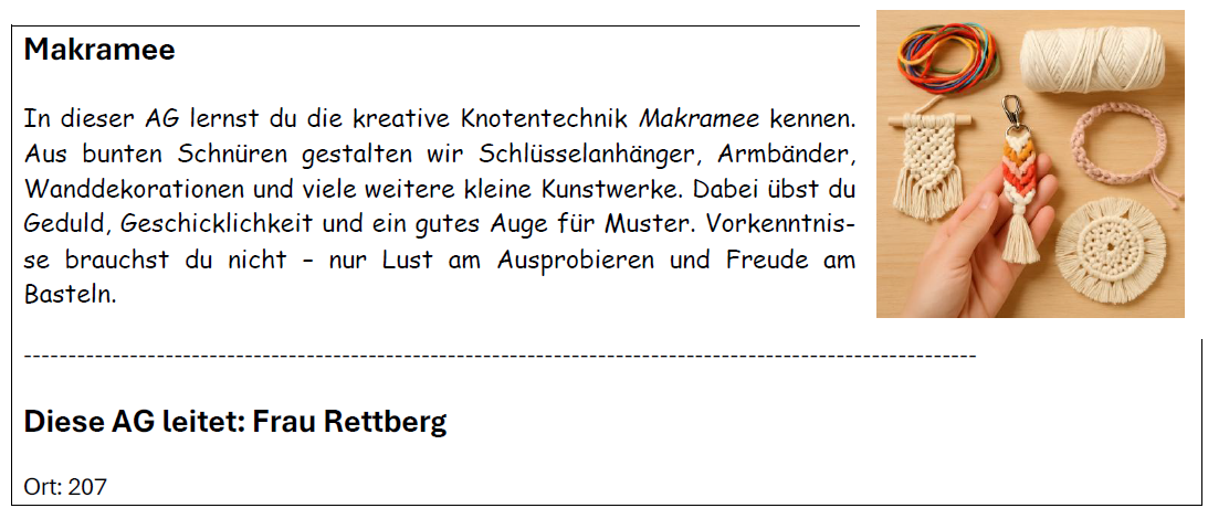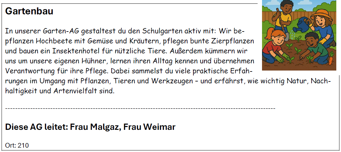 Hier findet ihr eine Übersicht über unser vielfältiges AG-Angebot für alle Kinder der Jahrgänge 5 und 6 – spannende Aktivitäten aus verschiedenen Bereichen warten darauf, entdeckt zu werden!