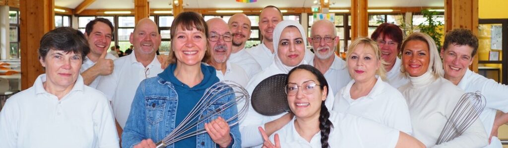 Von links: Christine Sowa / Thomas Rottmann-Sostak / Frank Schmitten / Melanie Sostak (Geschäftsführerin) / Eberhard Weiß / Patrick Enders (Koch) / Markus Klasing / Mounia Toubaghi / Funda Özgüvenc / Oliver Schenk / Vida Popovic / Silvia Krone / Yeliz Arslan / Hiltrud Fröse van-Bebber (Küchenleiterin)